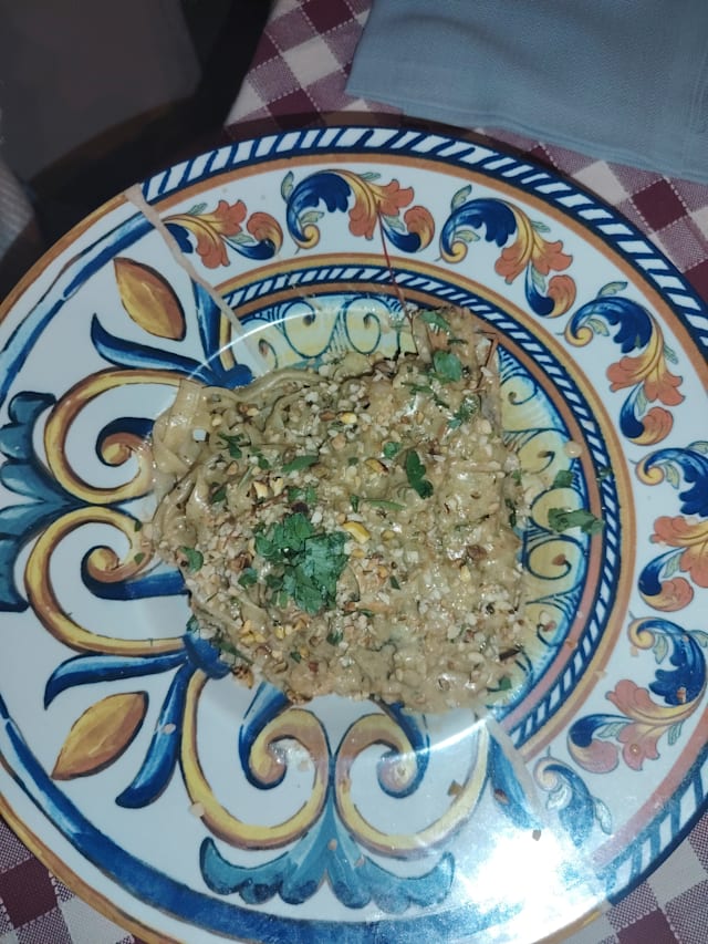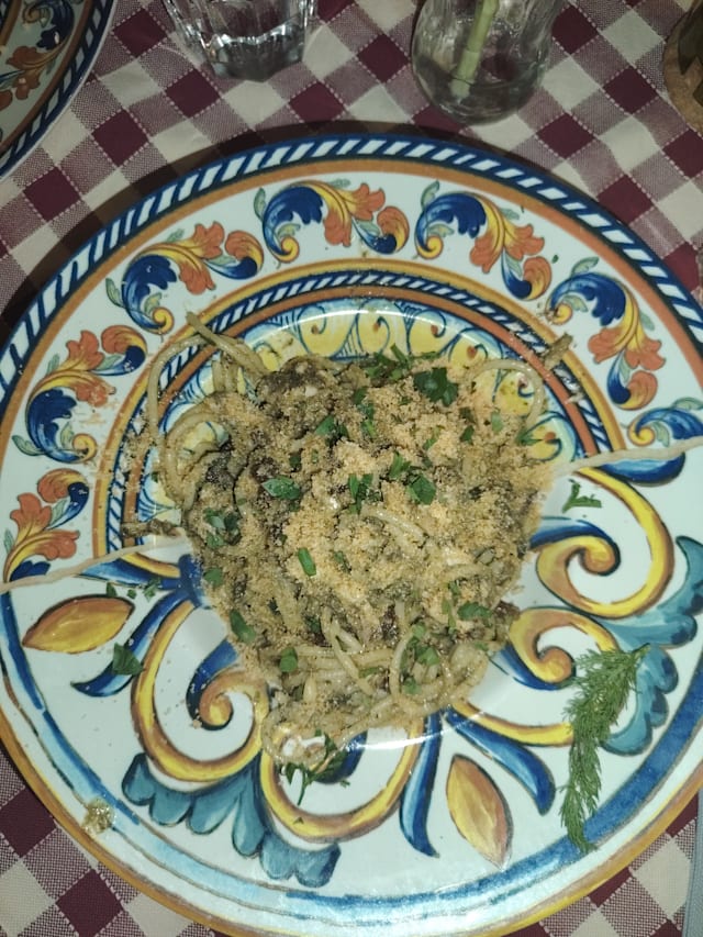 10/10A charming taverna set in relaxed Sicilian style. The carpaccio di tonno together with caponata as a first course with the house rosso was very delicious! Next came pasta with sardines, wild fennel, pine nuts and raisins: so good! The service was attentive and gracious, and despite my broken Italian, i was able to get by with the help of the staff's limited english. This taverna has plenty of room outside and indoors to welcome families and larger parties. All in all, it was a wonderful meal paired with warm Italian hospitality. Grazie mille!