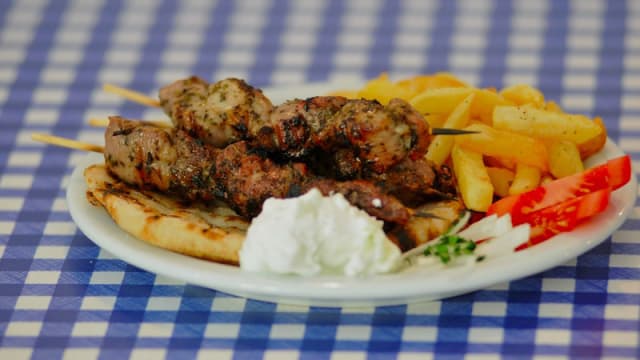 Galletto grigliato con burro e spezie, servito con pita, pomodoro fresco, cipolla, tzatziki e patatine fritte.
