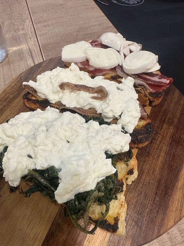 Tris di bruschette cicoria e stracciatella – stracciatella e alici – mortadella e pistacchio. Compreso di bevanda a scelta tra: drink - soft drink - vini alla mescita - birre alla spina (0,40cl)