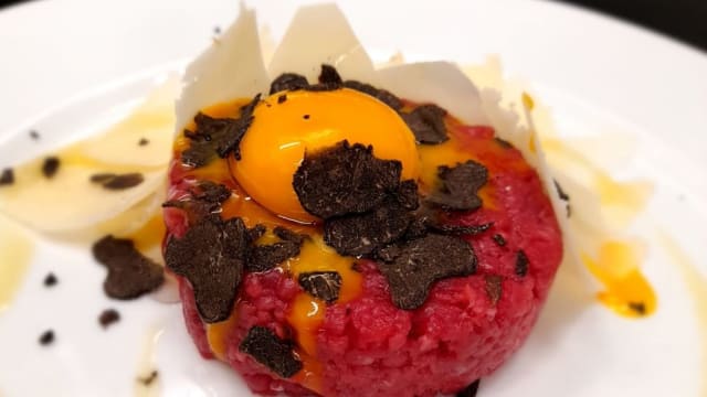 Tartare di chianina al coltello con scaglie di grana e vinaigrette alla senape
