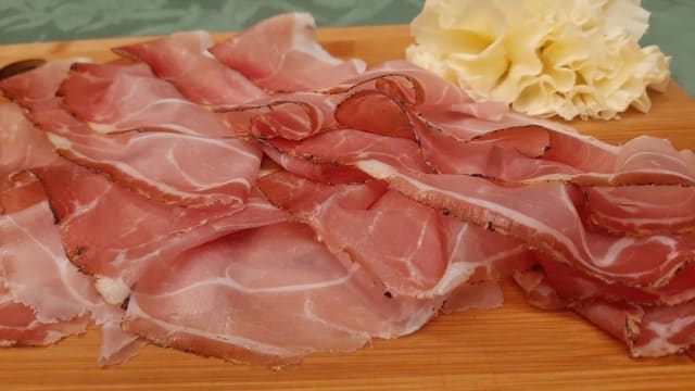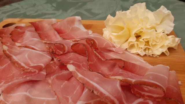 Tagliere delle taverna: selezione di affettati, sopressa nostrana, pancetta arrotolata, crudo di sauris, asiago dolce, pecorino, gorgonzola e pane