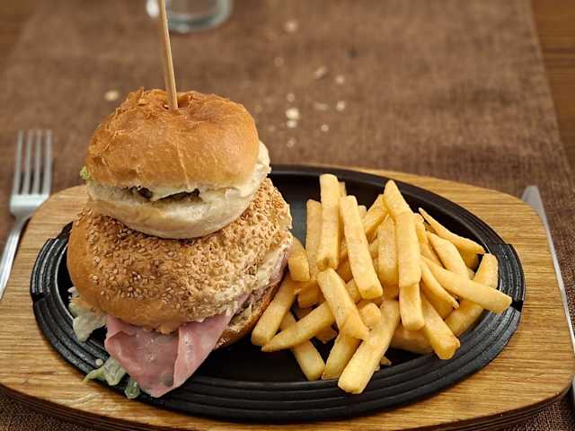 - Hamburger di angus, insalata, salsa BBQ, cheddar, uovo occhio di bue, pancetta, anelli di cipolla