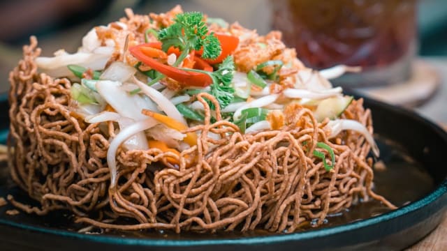 Nouilles de blé frites, fruits de mer; calamars, clams, scampis, moules, écrevisses, légumes sautés et sauce huître.