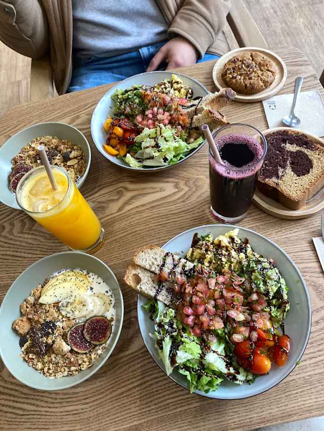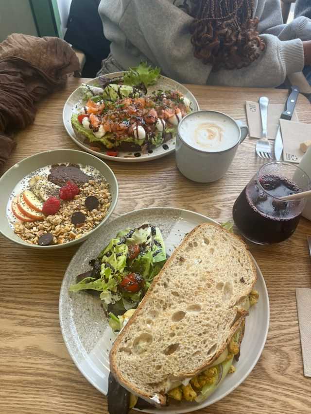 - Pain au levain, oeuf brouillés, guacamole, saumon fumé, tomate cerise, grenade.