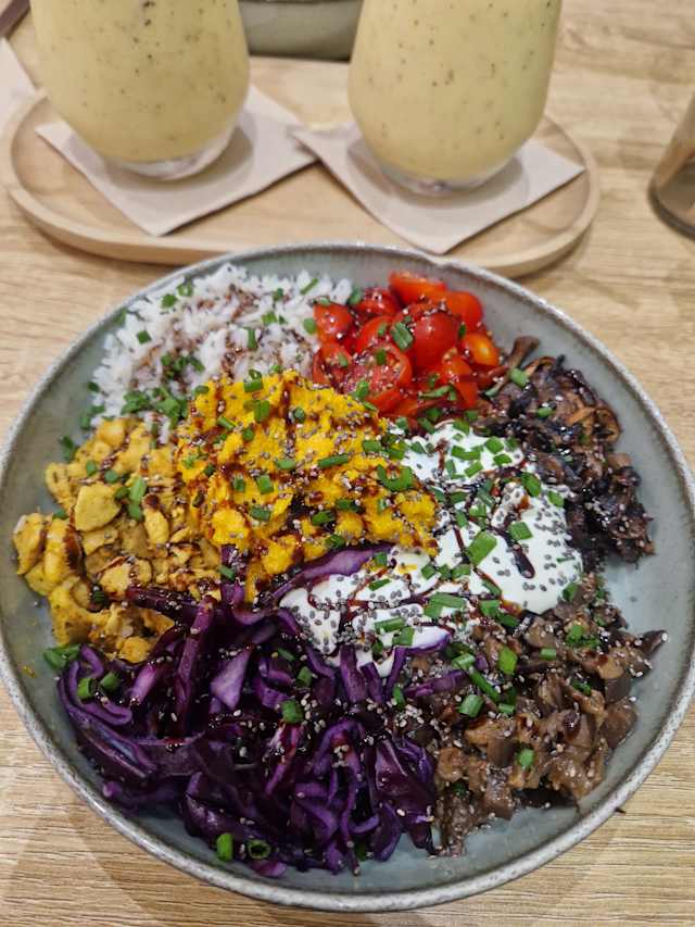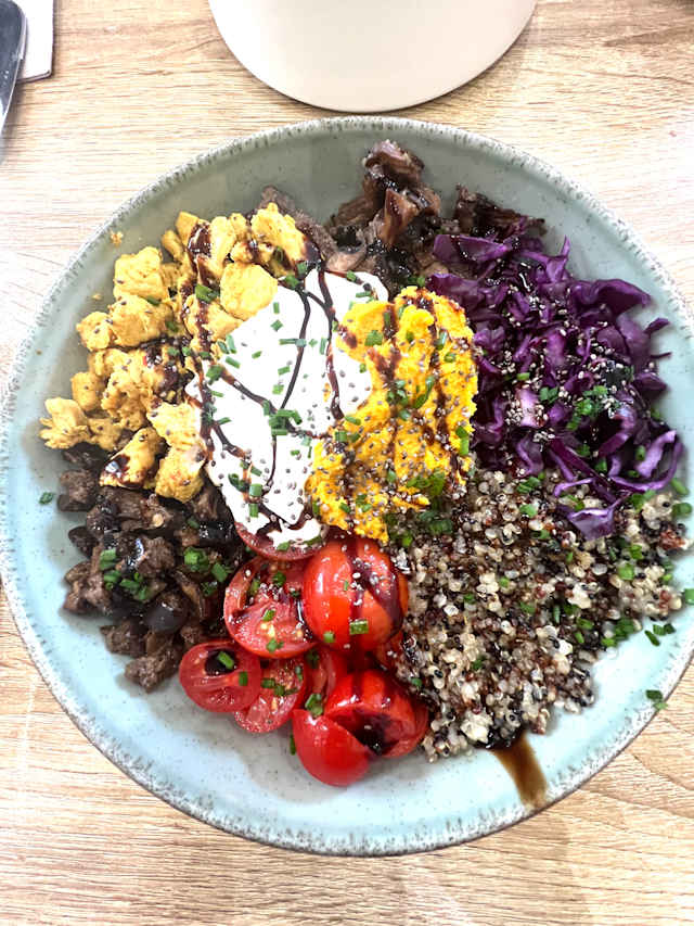 - Riz ou quinoa au choix, concombres, tomates cerises, pêches, burrata, crème de pesto maison, protéines au choix, balsamique aux fruits rouges, graines de chia, ciboulette et basilic.