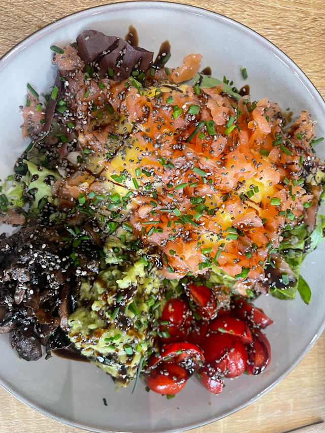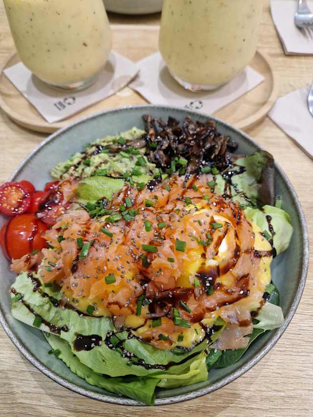 - Plain au levain complet, oeufs mollets, sauce hollandaise maison, saumon fumé, guacamole, champignons marinés, tomates, salade, balsamique, graines de chia, ciboulette.
