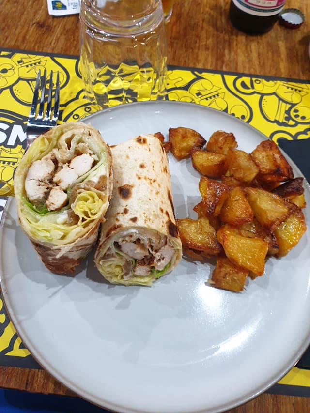 Wrap con pollo fritto, insalata, pomodoro, mayo al pepe servito con abbondanti patate al forno.