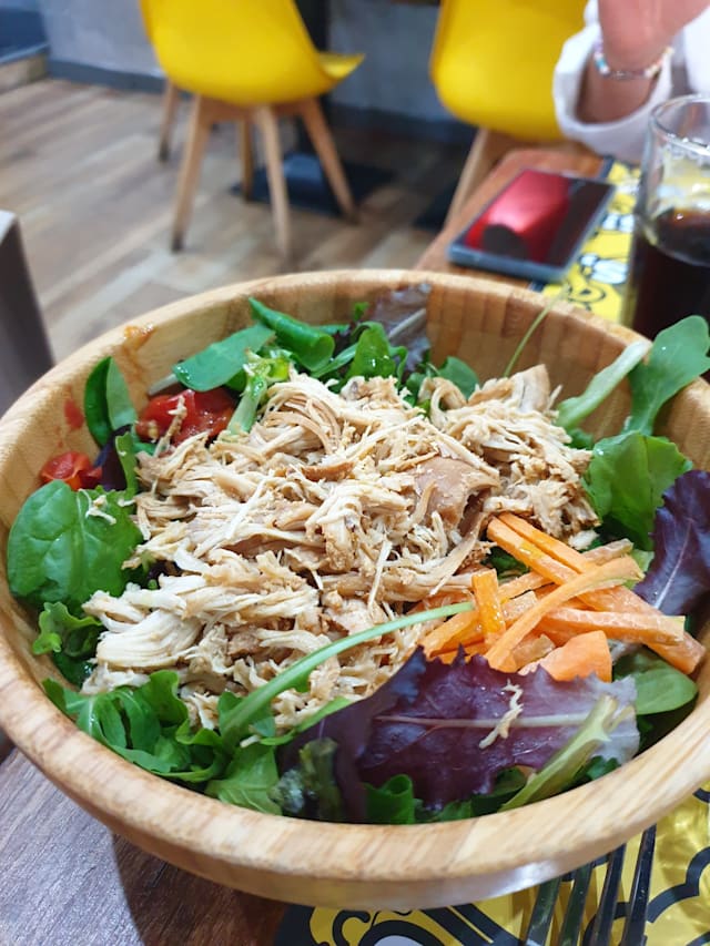 Bun artigianale, pollo sfilacciato cotto a bassa temperatura, bacon croccante, cheddar filante, lattuga, pomodoro, mayo al pepe