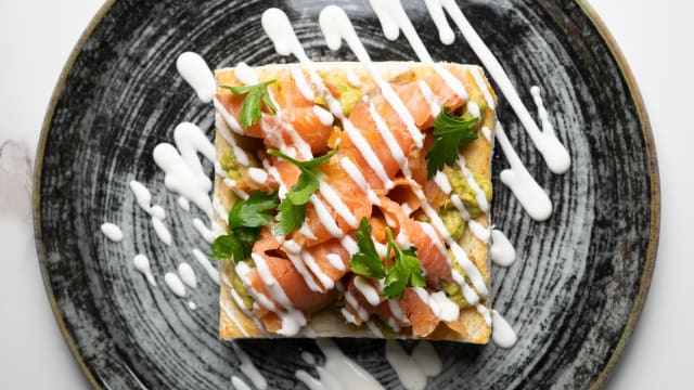 Pane a lievitazione naturale “forno degli amici”, salmone affumicato, guacamole homemade, salsa yogurt.