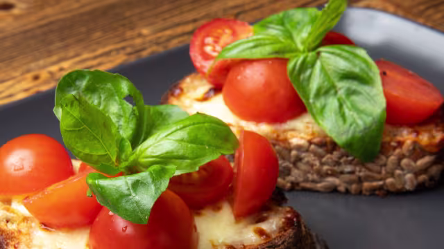 - Pane tostato, mozzarella filante e pomodorini freschi.