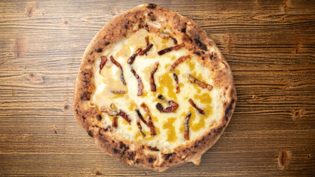 Una pizza colorata e ricca di sapore, condita con un mix di zucchine, peperoni e melanzane grigliate, che esaltano la freschezza. La base di pomodoro e mozzarella offre un equilibrio perfetto, mentre le verdure danno un tocco rustico e sano.