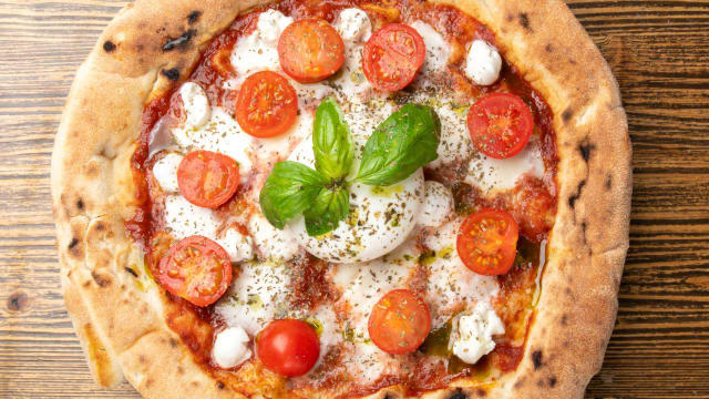 Una pizza dal sapore rustico e ricco, con una base di pomodoro del contadino, fresco e saporito, arricchita da mozzarella di bufala cremosa e foglie di basilico fresco.