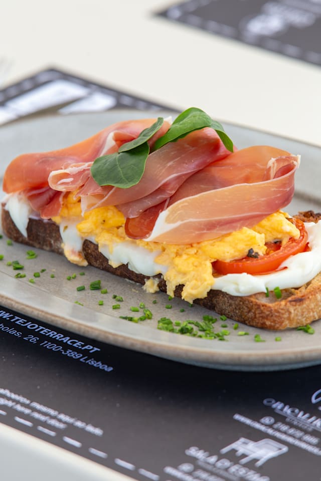 Presunto serrano, ovos mexidos com tomate assado e queijo de ovelha cremoso.