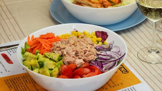 Insalata mista con tonno, mais dolce, carota, cipolla rossa pomodoro, avocado e salsa.