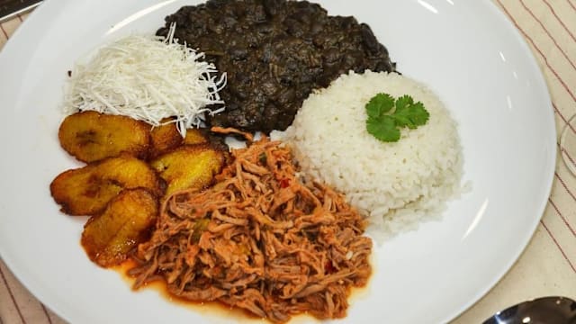 Tenera carne di manzo sfilettato con riso bianco, fagioli neri stufati lette di platano maturo fritte.