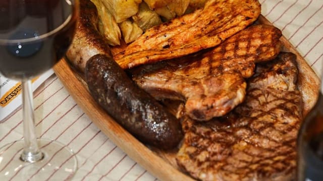 Mix di manzo, maiale, pollo e salsiccia alla griglia, accompagnati da insalata yuca (manioca) e chips di platano verde.