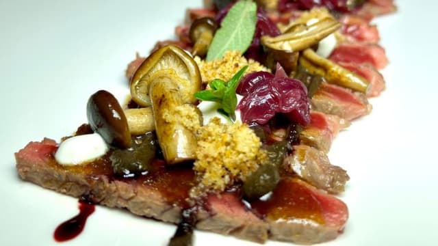 Condita con colatura di alici di cetara e salsa soia, crostone di pane rustico, emulsione di acciughe, tuorlo d’uovo marinato, bernese e salsa al tartufo