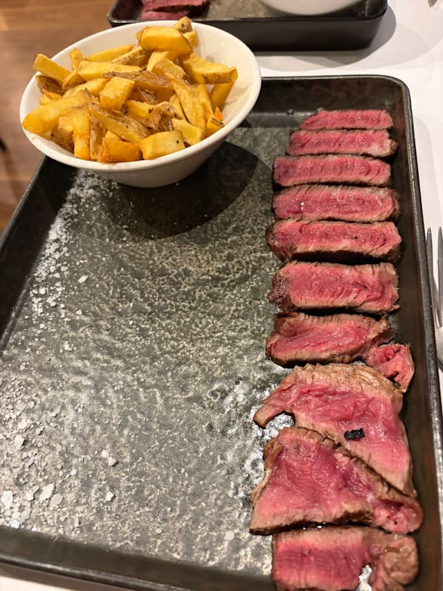 6/10It was rather confusing regarding choosing the meat - I don’t feel it was explained very well ~ so we ended up with regular filet steak that was sliced into thin pieces on a slate - this I have to say was infact excellent and beautifully tender ! This was accompanied by chips and salad : the chips were rather uninspiring however., and the waiter forgot my salad - which when it did arrive was fresh but heavily oiled : both chips and salad were served in small hand sized bowls : the staff were friendly but a little distracted : we both had a selection of 4 cheeses to start : small portions but fresh and (just) adequate : a bottle of nice acceptable red wine to accompany ~ coffee to finish - bill just under 120€ - so for what we had an ‘acceptable’ price - I would have liked to have understood the meat choices better as there are definitely more richer cuts than we had : not particularly liking much fat on meat, does narrow the choice down. however: I wouldn’t totally rule out a revisit