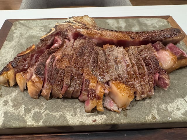 8.5/10Fun experience choosing our steak and having it served table side. Delicious wine and great service. The steak was good, cooked perfectly and nicely marbled-,just a little different flavour and unusual for us to have Holstein steak.