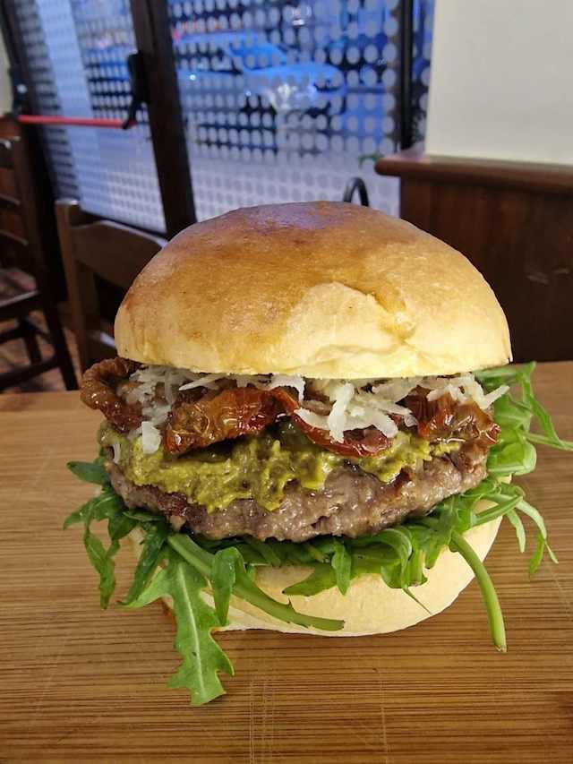- Hamburger macina teneritaly 180 g, crema di pesto alla genovese, pomodori secchi, scaglie di grana e rucola