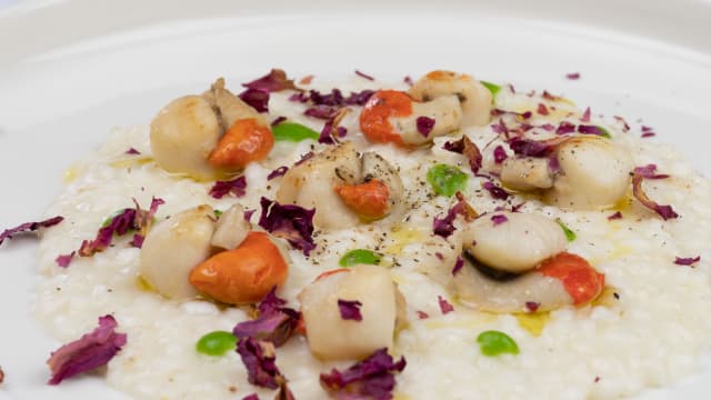 Riso vialone mantecato al prosecco con capasanta e polvere di rose