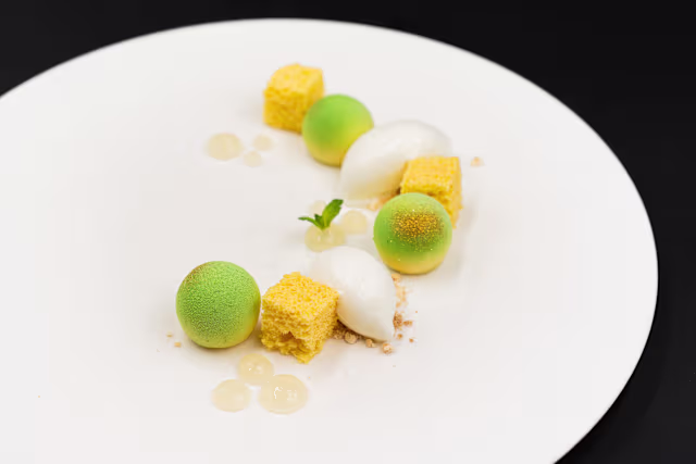 - Lemon bavarian cream au gratin, crunchy biscuit with green apple, celery and ginger sorbet