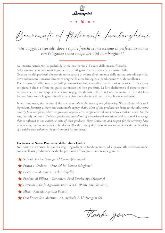 9.5/10+1What an enjoyable lunch at Tenuta Lamborghini. Flawless service and creative and delicious food.