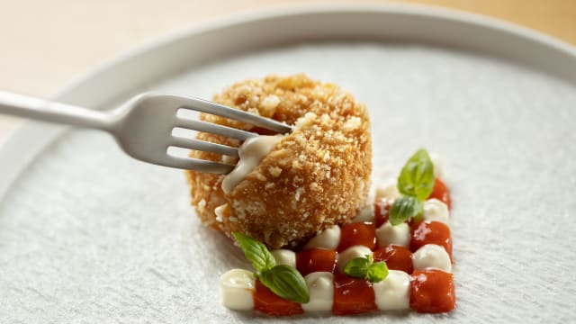 Melanzana croccante, dressing al pomodoro arrosto, spuma di burrata ed estratto al basilico.