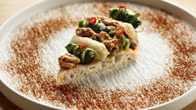 Tortellaccio homemade alla modenese, brasato di cavallo in bianco, brodo in stile thay, granulato al sesamo nero e germoglio fresco di portulaca.