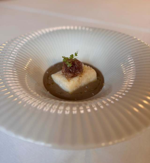 - Merluzzo in crosta di pane panko e mandorle, salsa bernese e bietole multicolor