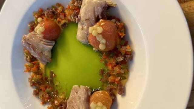 Con sardina ahumada, aceite de perejil, tomates y granizado de piparra