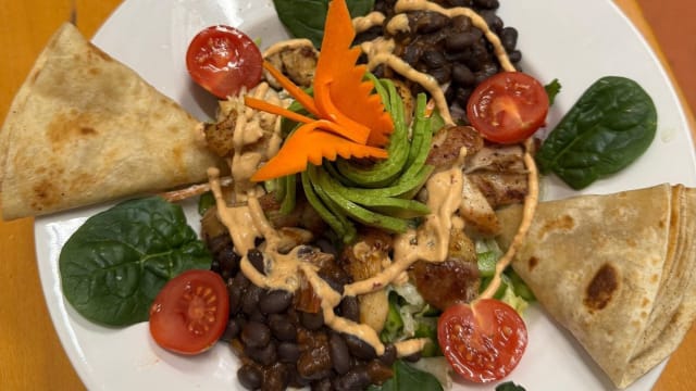 Grilled chicken over lettuce, spinach, avocado and diced tomatoes, topped with pica de gallo, tortillas and sauce