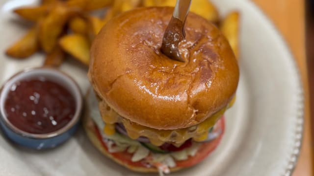 Burger with ground beef, cheese, lettuce, tomato, onion, avocado and homemade sauce