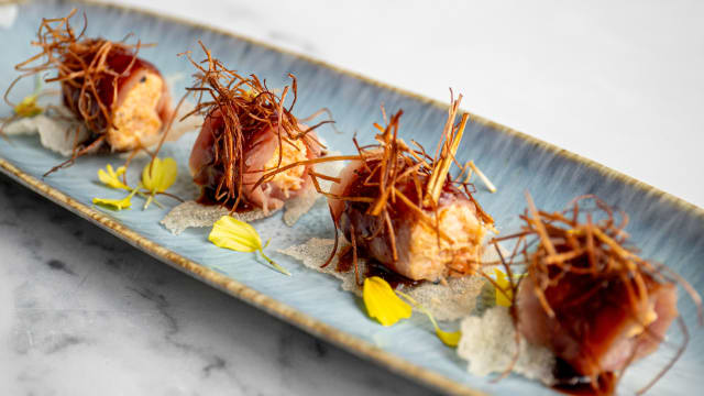 Camarão picado com maionese japonesa, especia-rias e sésamo enrolado com atum e finalizado com teriyaki e alho francês frito