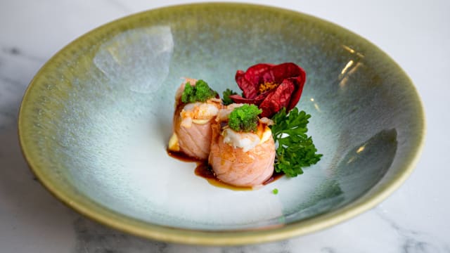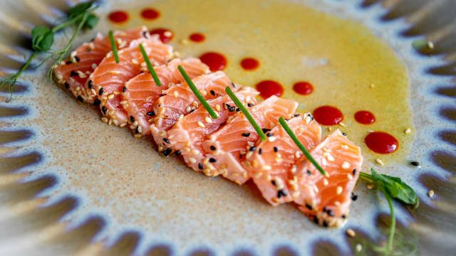 Fatias de salmão selado com sésamo, temperado com azeite de trufa, cebolinho frito e teriyaki