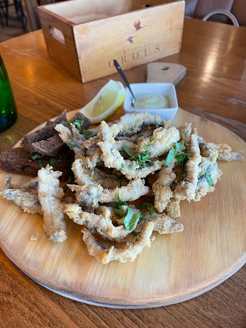 9.5/10Great friendly service, we chose fish from the bar, we had clams and bicerao for starter, and shared a local fish with salad and chips. Bonoffee pie for dessert - it was all delicious - €87 for the two of us which I felt was reasonable for the quality - the decor is nice but the incongruous projector screen showing football just didn’t fit the ambiance of the restaurant.