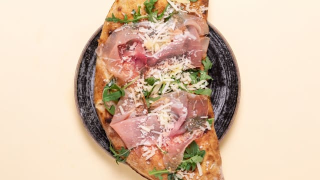 Pomodoro ciliegino *, mozzarella fiordilatte *, rucola, prosciutto crudo di parma, scaglie di grana