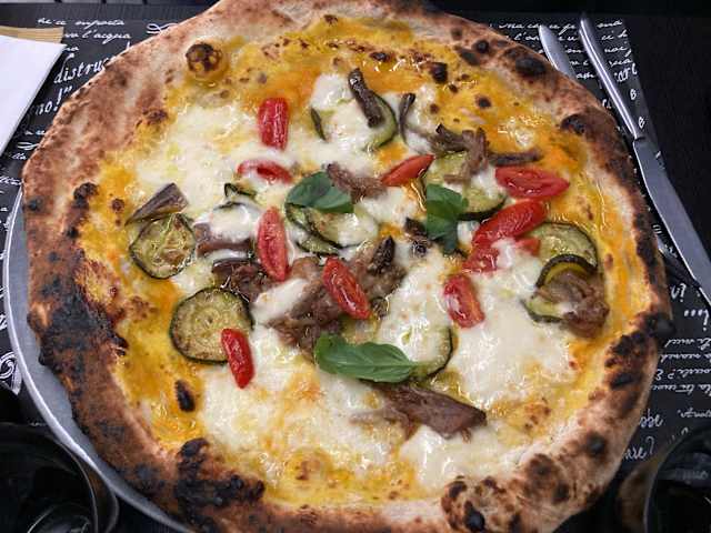 Provola di agerola, porchetta artigianale nostrana, funghi champignon. All'uscita olio EVO e peperoncino in fili