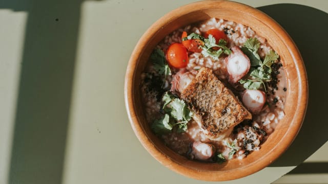 Arroz de polvo, nori, mexilhão, azeite verde e limão