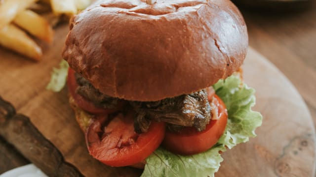 Burger de novilho, queijo brie, molho barbecue e cebola caramelizada