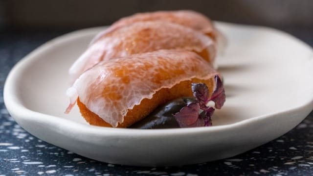 Bombones de pato confitado con puré de robuchón y demiglace tailandesa,