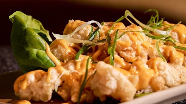 Palomitas de gambón sobre hojas de trocadero, chutney de mango y mahonesa de kimchi