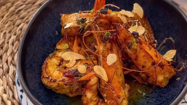 - Camarão frito, vagem, tomate, abacate, ovo e molho de pimento