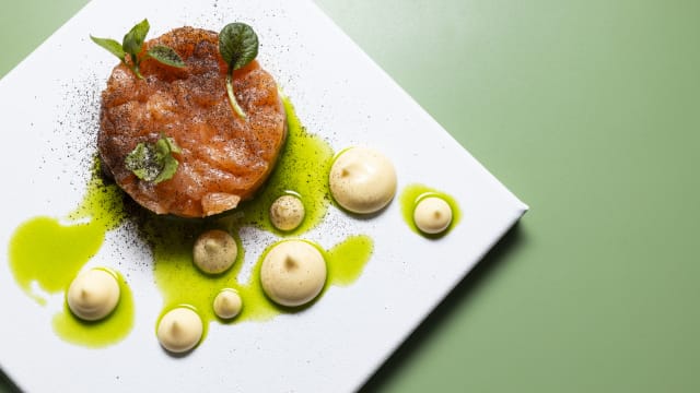 Tartare di gambero rosa con mela verde e salsa di barbabietola