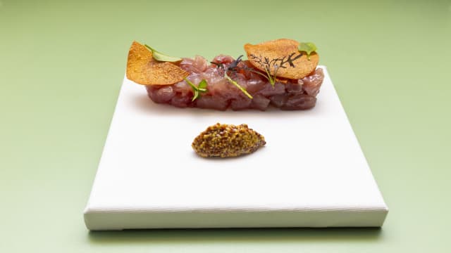 tartare di manzo con mille foglie di patate fritte e salsa di peperoni in agrodolce