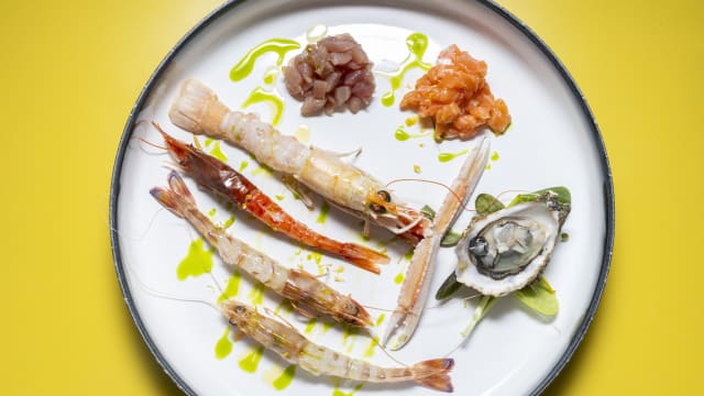 con ostrica, mazzancolla, gambero rosso, scampo, tartare di tonno, tartare di salmone, tartare di gambero conditi con olio, sale, pepe e zeste di limone