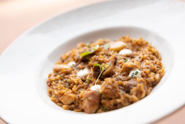 Arroz de sepia, costilla y puntillas fritas con alioli de ajo asado