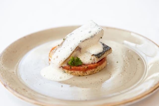 Corvina con mantequilla noisette, alcaparras crujientes y puré de zanahoria especiada