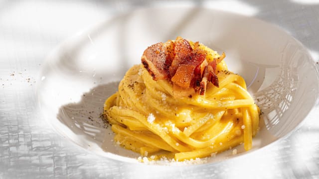 Fresh pasta, eggs yolk, guanciale (pork jowls), pecorino cheese and black pepper