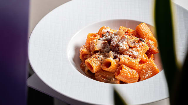 Pasta with tomato sauce, guanciale (pork jowl), pecorino cheese and black pepper